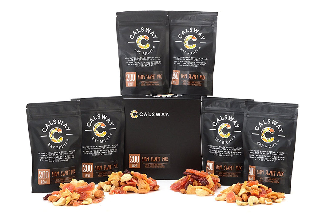 - All Calsway products are carefully selected and approved by our nutritionists. For the price you get a box with six 200 kcal packs of delicious Calsway Siam Sweet Nuts, Fruits and Berries Mix (49,6 g per pack).